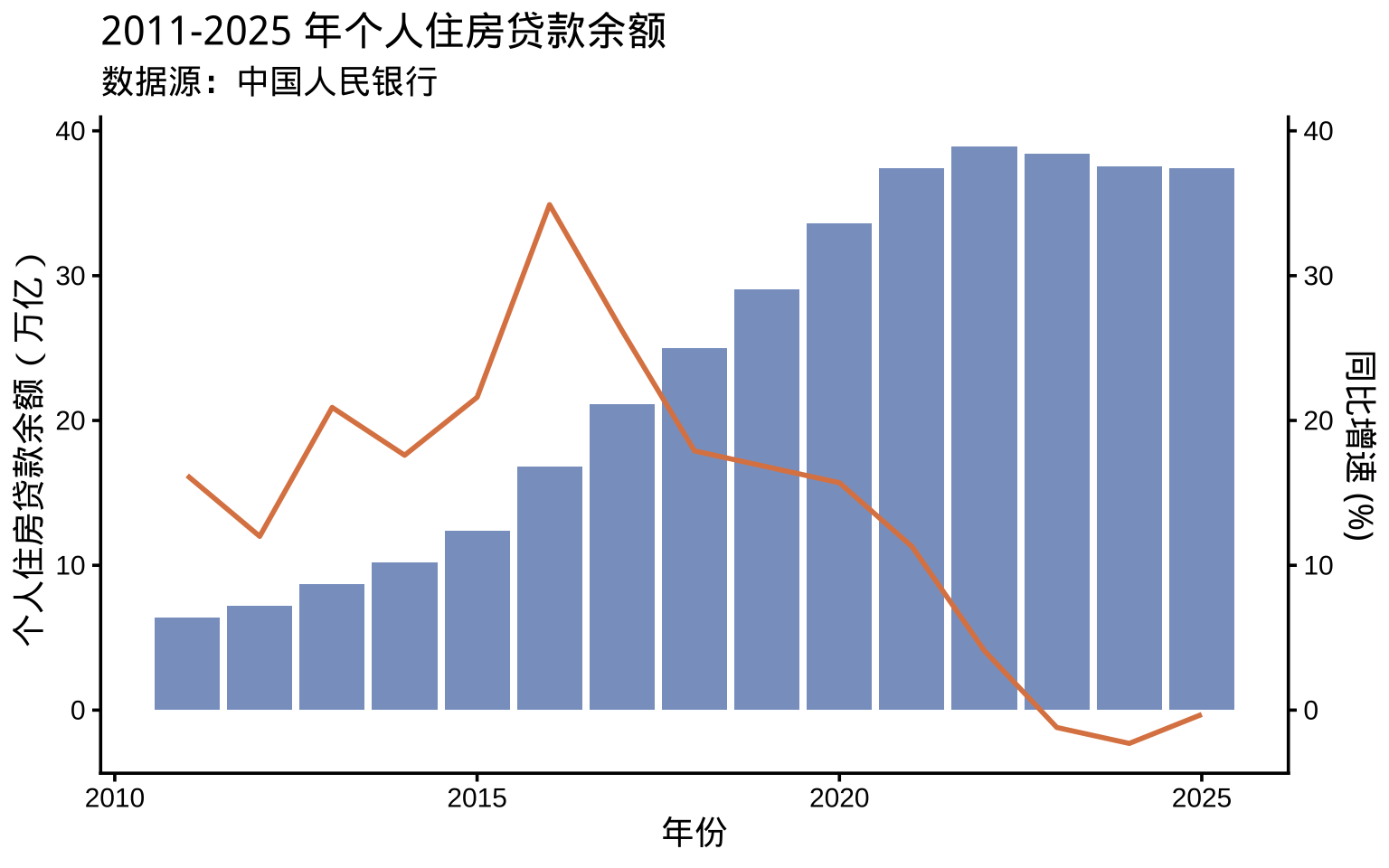 labs(title = "2011-2025 年个人住房贷款余额", subtitle = "数据源:中国人民银行") +